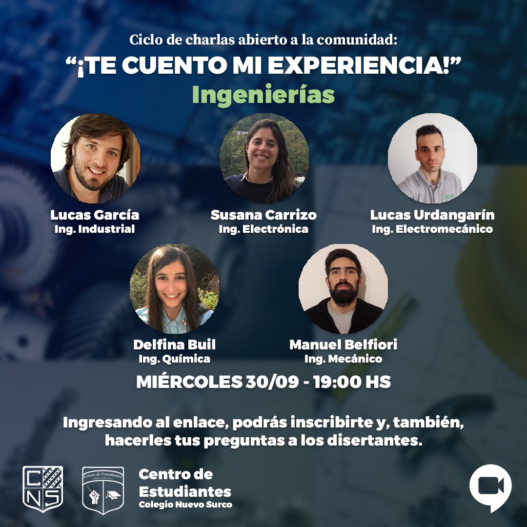 – “Ingenierías” a cargo de Delfina Buil (ing. química), Manuel Belfiori (ing. mecánico), Susana Carrizo (ing. electrónica), Lucas Urdangarín (ing. electromecánico) y Lucas García (ing. industrial). Miércoles 30/09 a las 19:00 hs.