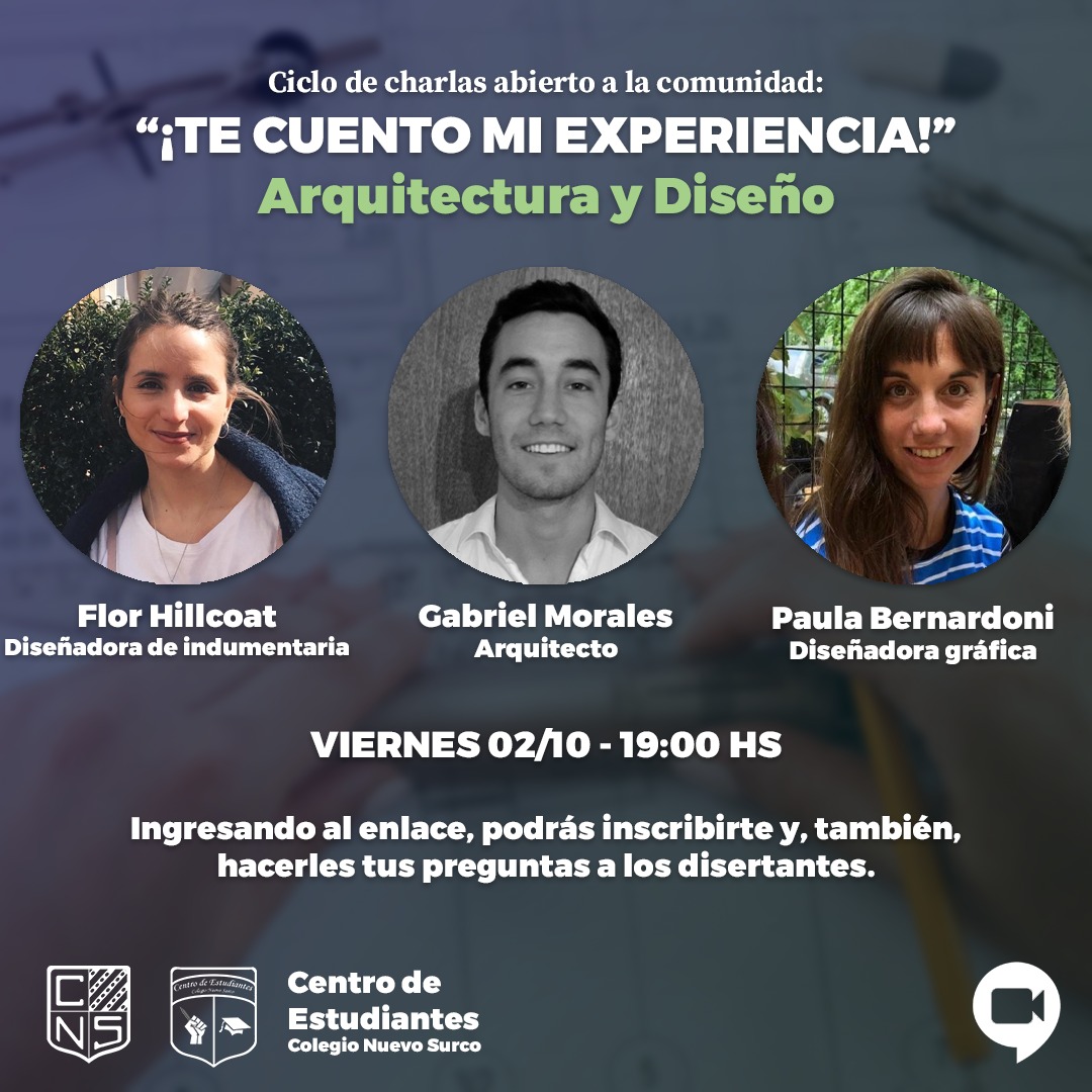 – “Arquitectura + Diseño” a cargo de Gabriel Morales (arquitecto), Flor Hillcoat (diseñadora de indumentaria) y Paula Bernardoni (diseñadora gráfica). Viernes 02/10 a las 19:00 hs.