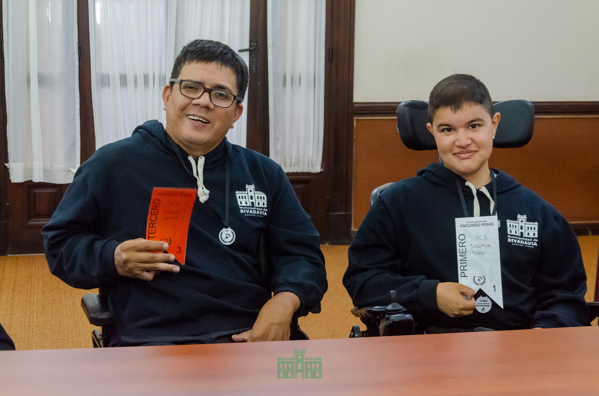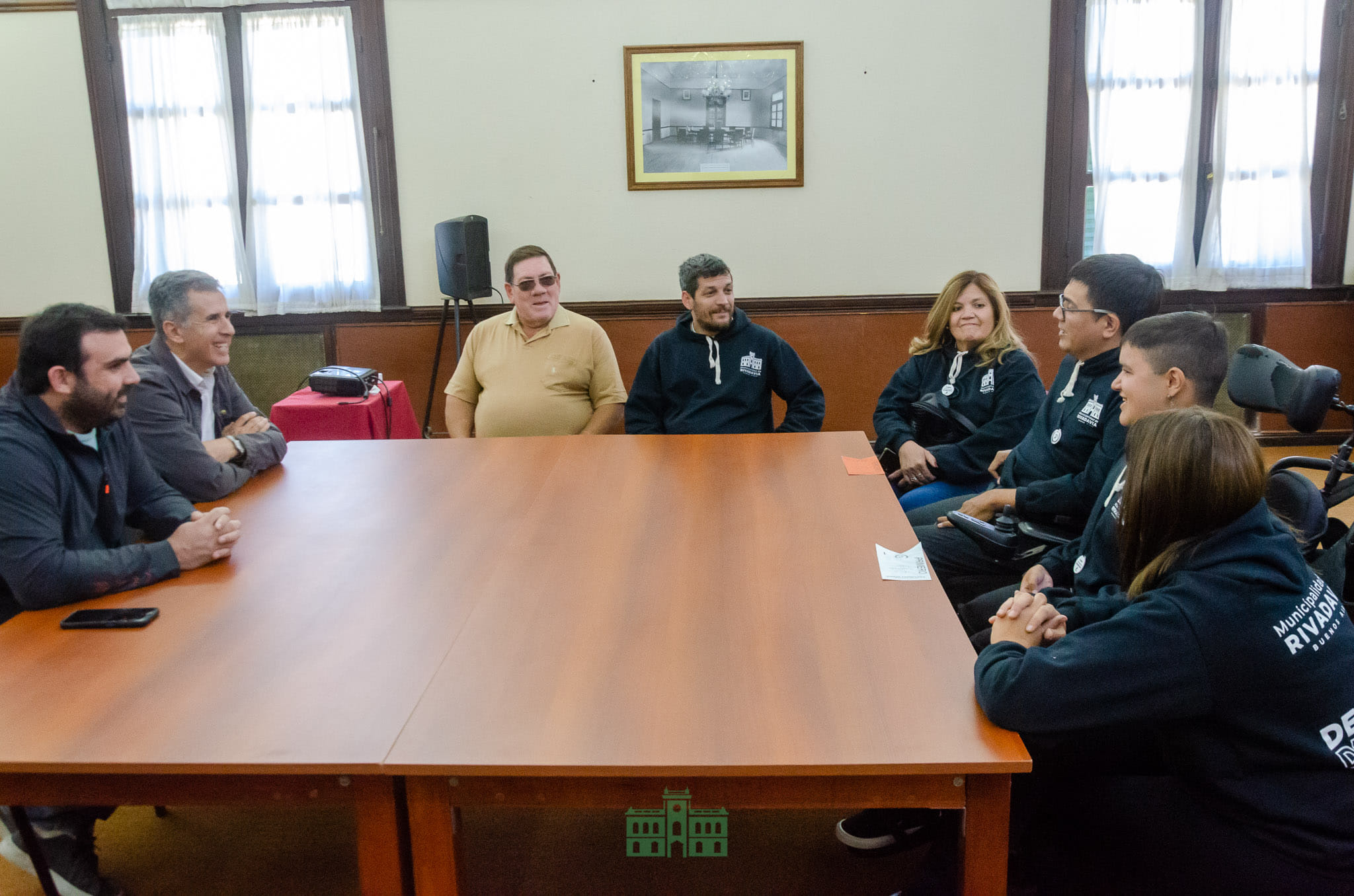 El intendente municipal, Juanci Martínez, y el director de Deportes, Edgardo Martínez, recibieron este martes a los deportistas Tobías Salomón y Héctor Medeiro, quienes recientemente participaron del Torneo Participativo “Facundo Rivas” organizado por el Centro de Actividades Alternativas para Personas con Discapacidad (CAAD) en la ciudad de Ushuaia.