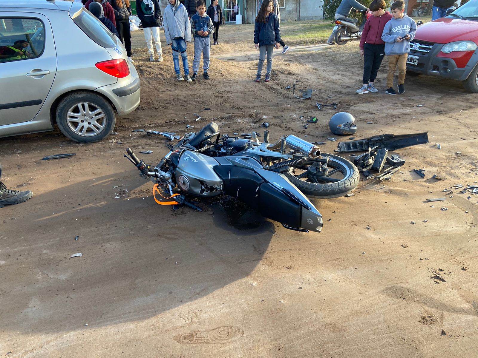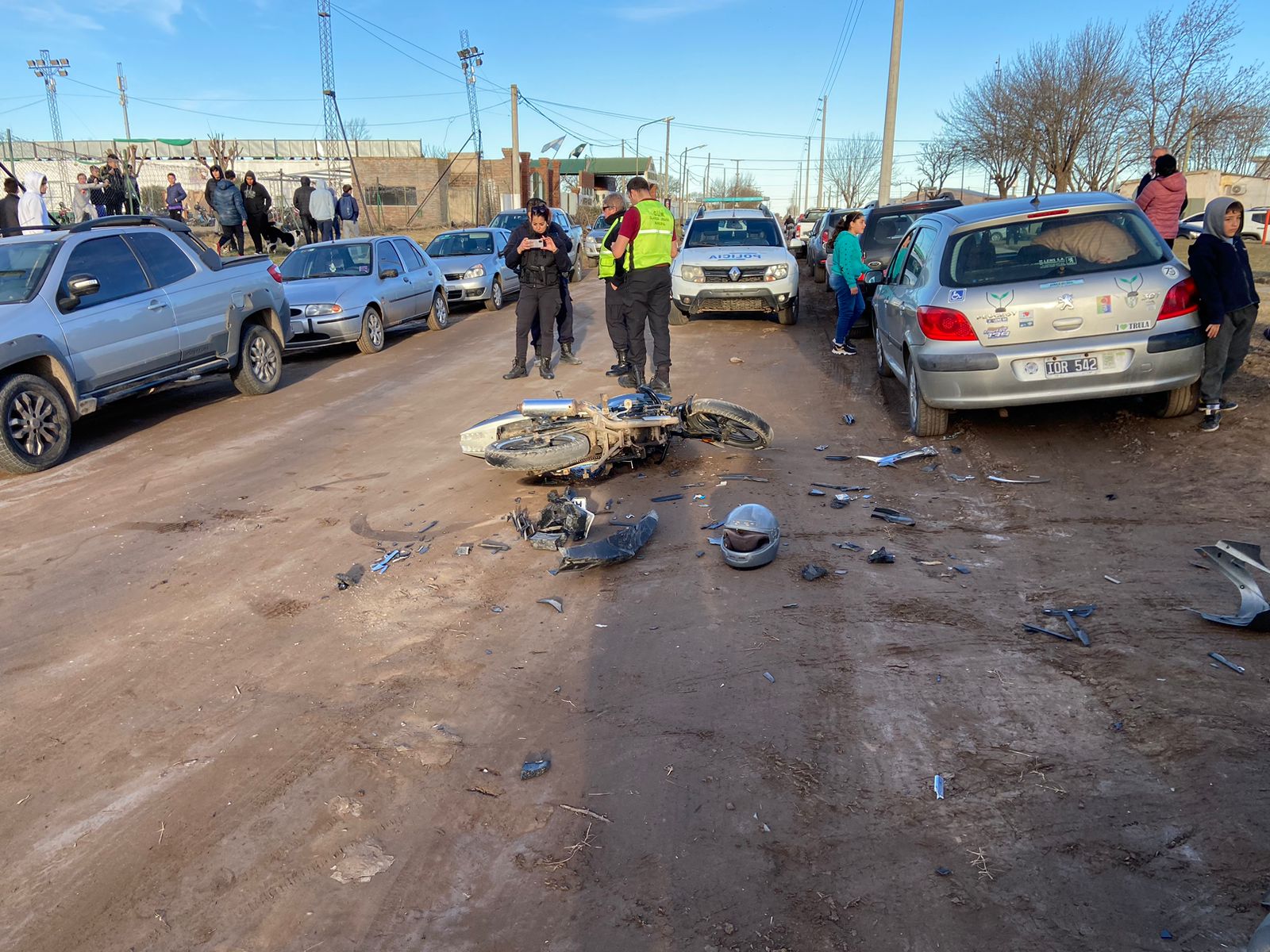 El siniestro vial sucedió en la tarde del domingo en calle Perón casi esquina Avellaneda en cercanías de la entrada del estadio Hermenegildo Nieto de Barrio Norte. Allí una moto conducida por un joven impactó fuertemente con un automóvil que salía del nuevo barrio a través de una calle lateral.