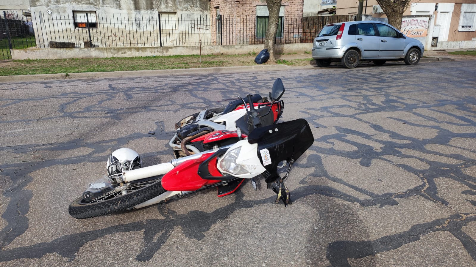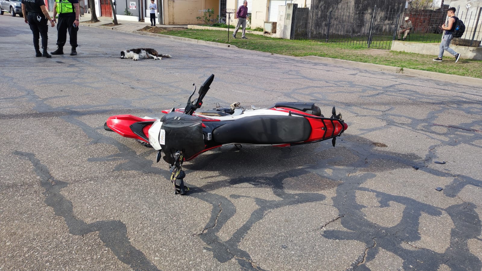 Cerca de las 17 horas se produjo el choque de la moto 250 cm manejada por un masculino mayor de edad con el can. Según pudo averiguar Master News, se trata de un “perrito de la calle, que los vecinos le dábamos de comer entre todos y estaba casi ciego por la edad avanzada” comentaron personas de la cuadra.