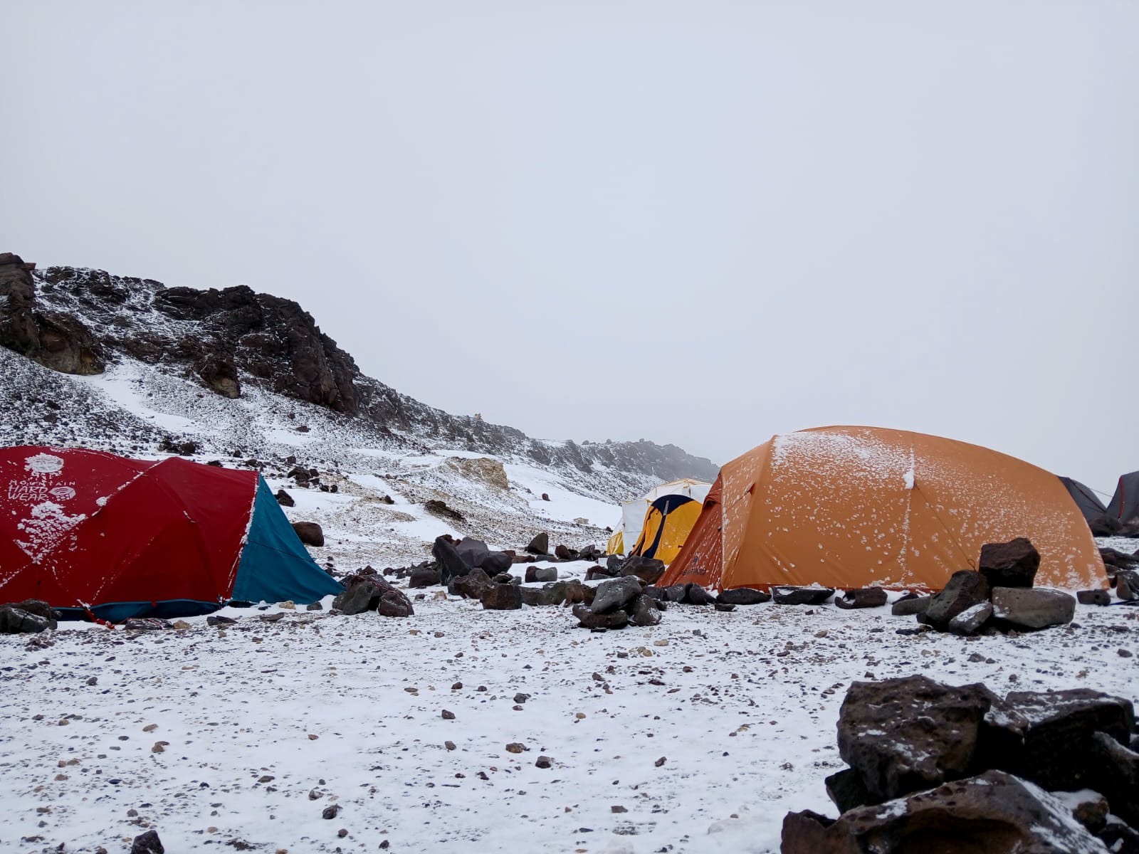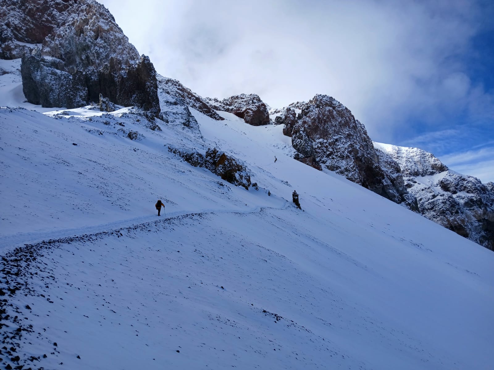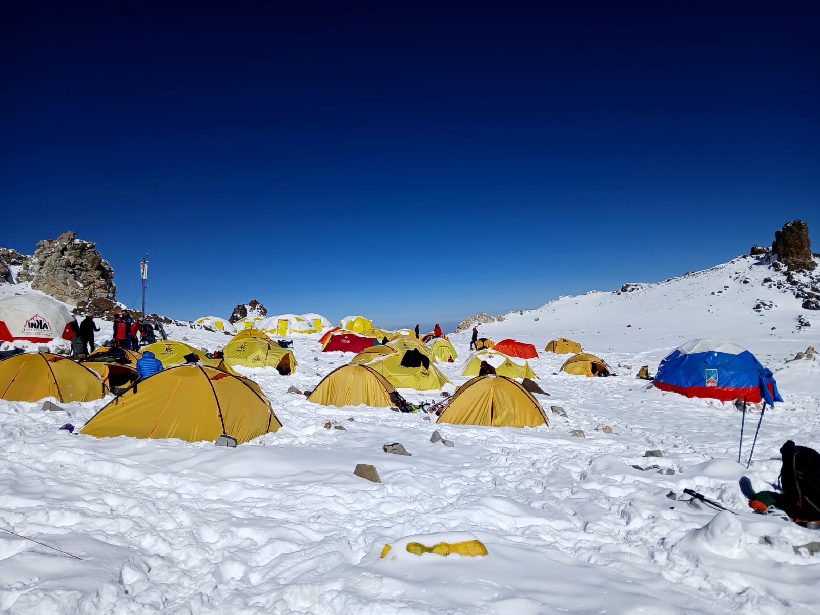 Mercado dijo al Primer Diario Digital de Rivadavia “Entré al parque el 5 de enero, ya hace casi 10 días, obviamente que es un cerro que no todos los días te da una ventana para poder ascender, y bueno, realmente nos fueron tocando días medio por ahí complicados porque en la primera parte del día estaba despejado y por ahí después se iba nublando y nevaba, pero bueno, el día de cumbre la verdad que fue durísimo en el sentido de que nevó mucho los días anteriores y por ahí había que pisar mucho sobre nieve y eso por ahí desgastaba mucho físicamente, obviamente que el día de cumbre es un día durísimo, son más o menos 8 ó 9 horas hasta llegar a la cima y después obviamente el descenso bajás muy cansado, muy extenuado”.