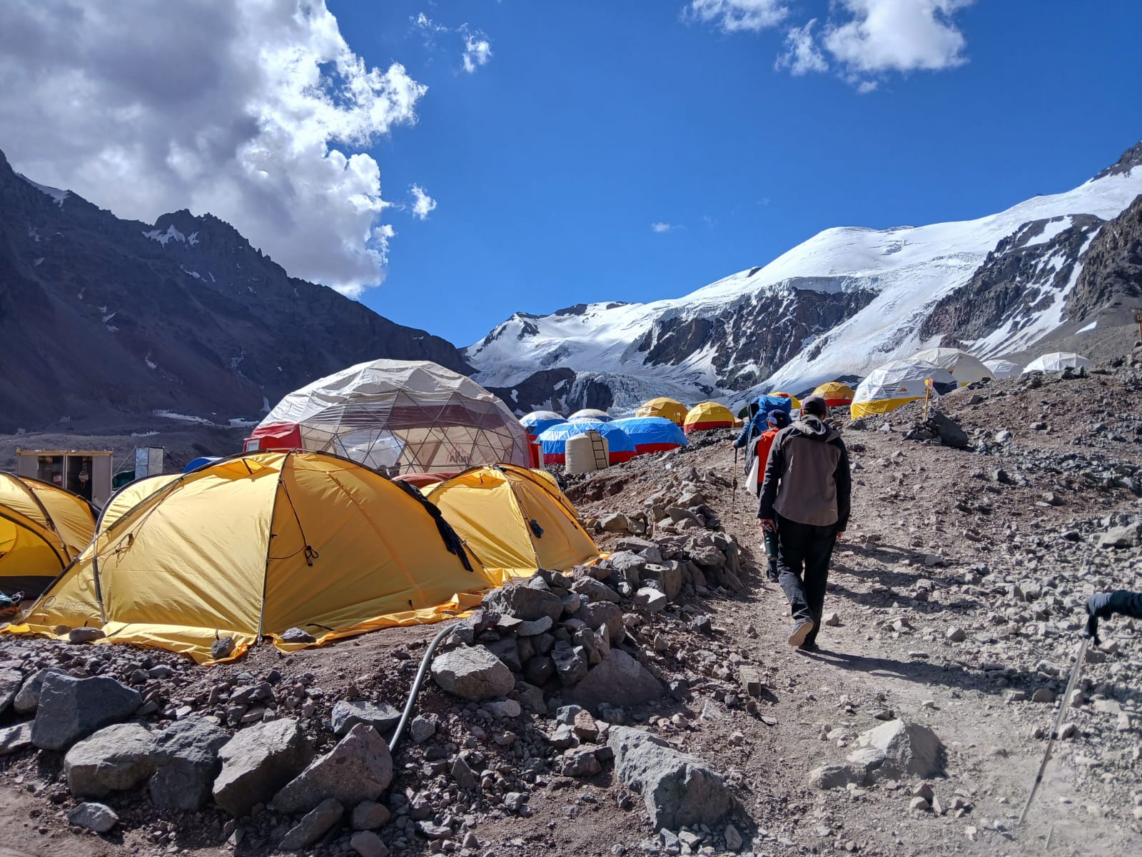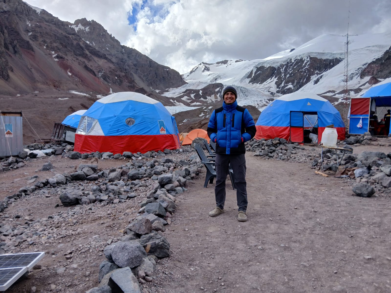 Sobre lo que vivió después Luis dijo “Pasé dos noches en un refugio ahí cerca del parque Aconcagua, obviamente descansando, preparando todo lo que sería el equipamiento. Una parte del equipo la traslada la mula, hasta el campo base Plaza de Mula, que está a 4.300 metros, que es donde yo estoy ahora. Normalmente ahí todas las expediciones y montañistas se establecen y, bueno, van preparando lo que sería el ascenso. Van teniendo un parámetro de lo que sería la climatología y cómo se van a presentar los días y van planificando por ahí la dinámica, ¿sí? De acá para arriba tenés tres campamentos de altura, que son Plaza Canadá, que está a 5.000 metros, Nido de Cóndores, 5.600 y Cólera, que es a 6.000 metros, que es el último campamento antes de llegar a la cumbre”