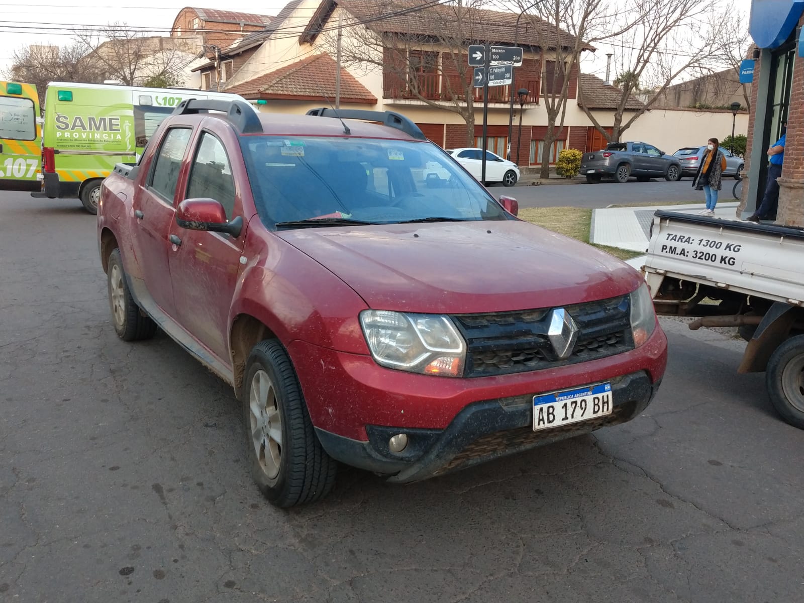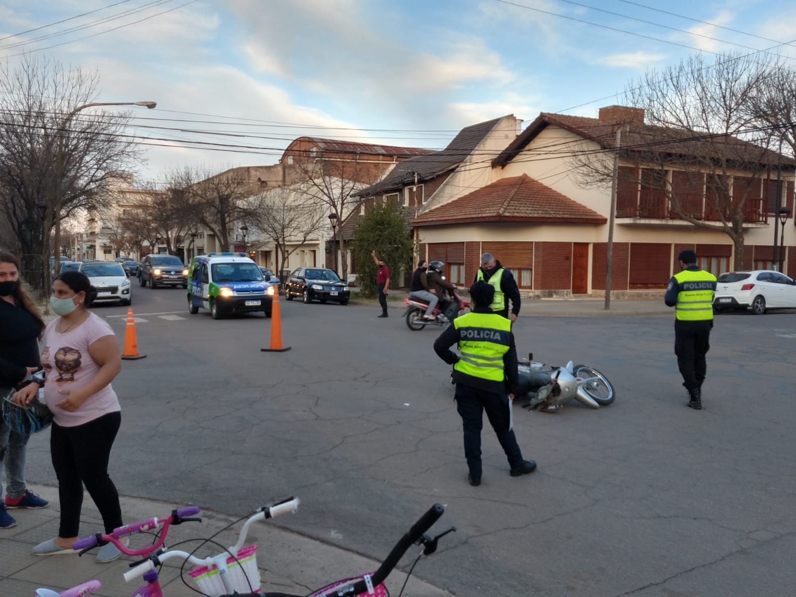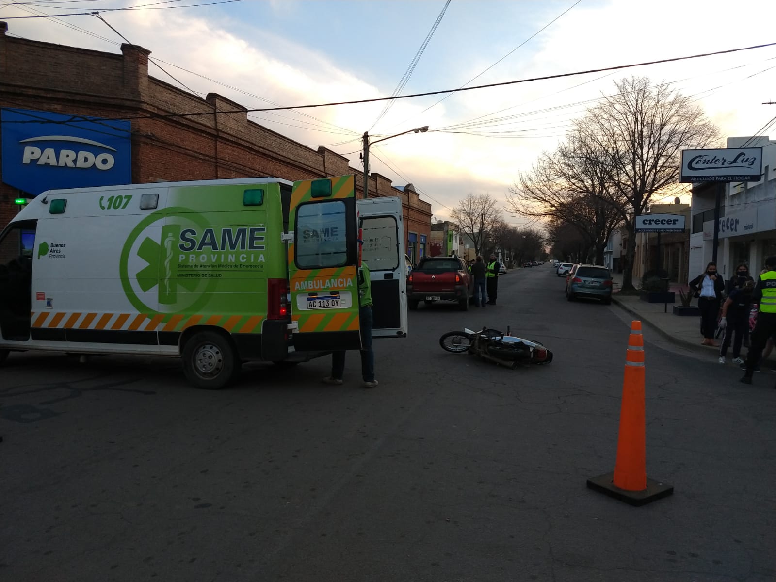 La camioneta Renault Oroch manejada por una mujer transitaba por Pellegrini en sentido este-oeste de la ciudad mientras que la moto 110 cc. lo hacía por calle Moreno en sentido norte-sur con una joven al volante. Al llegar a la intersección de ambas arterias se produce la colisión que deja a la menor de edad en el piso con golpes y lesiones.
