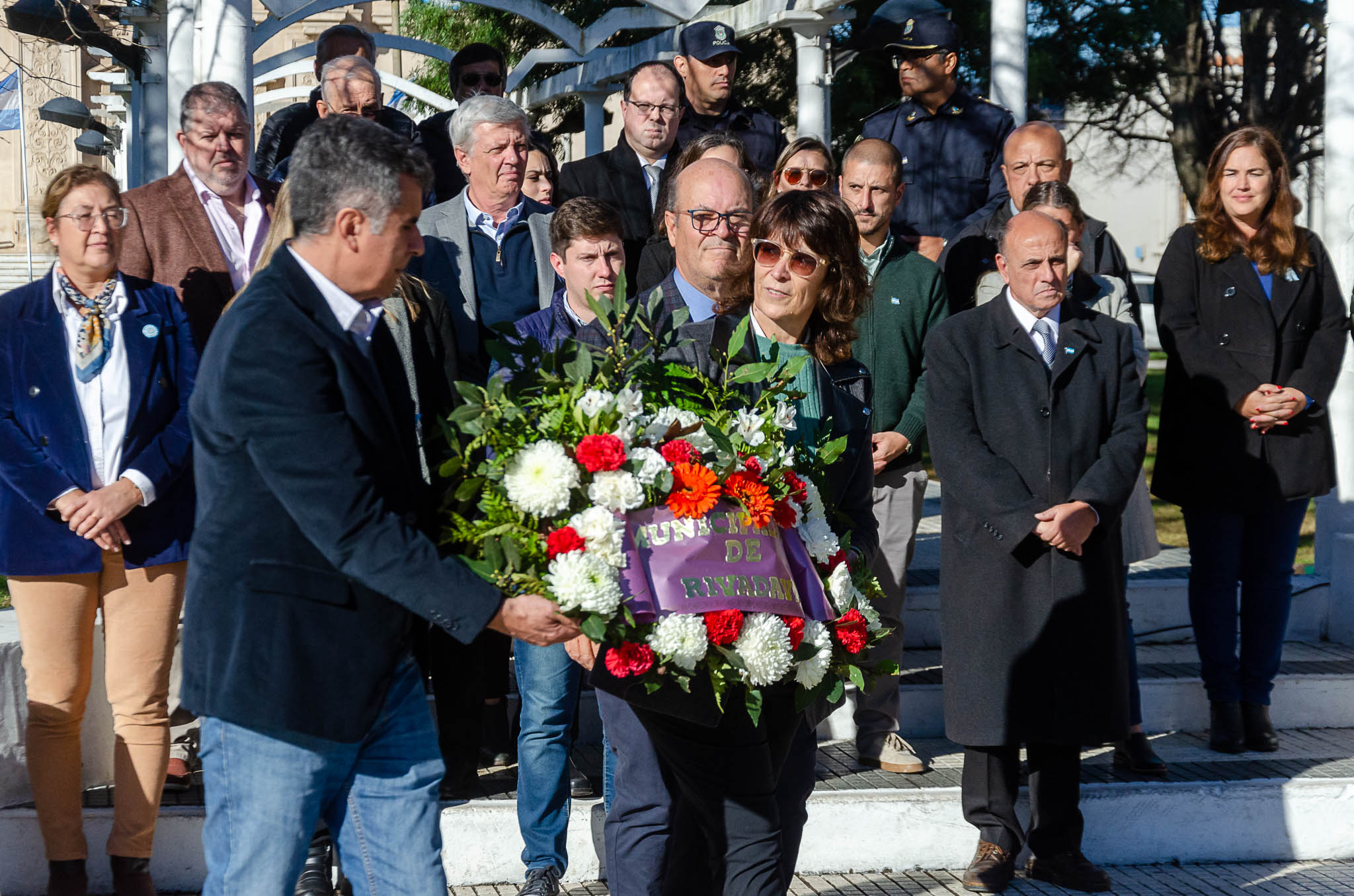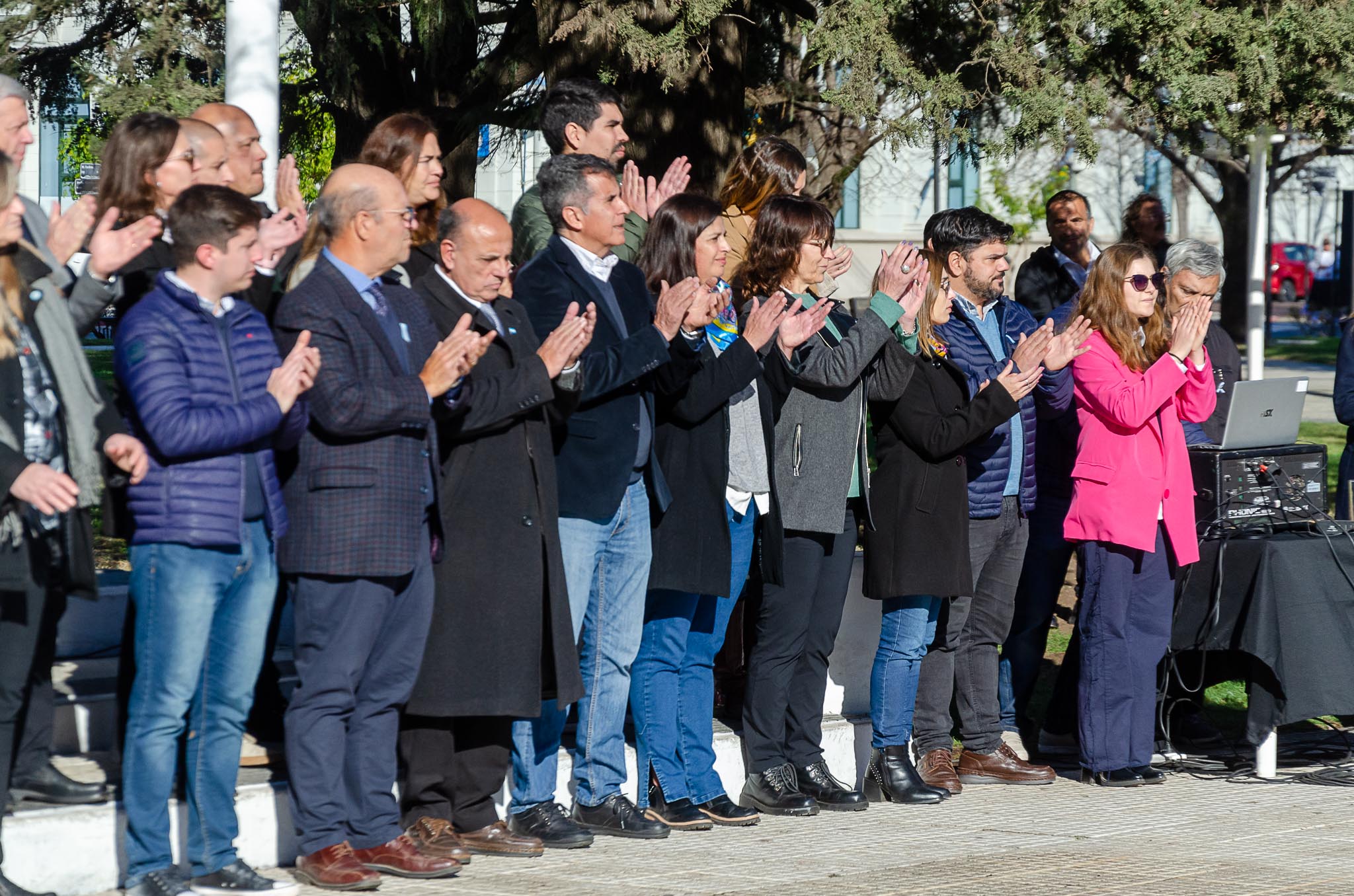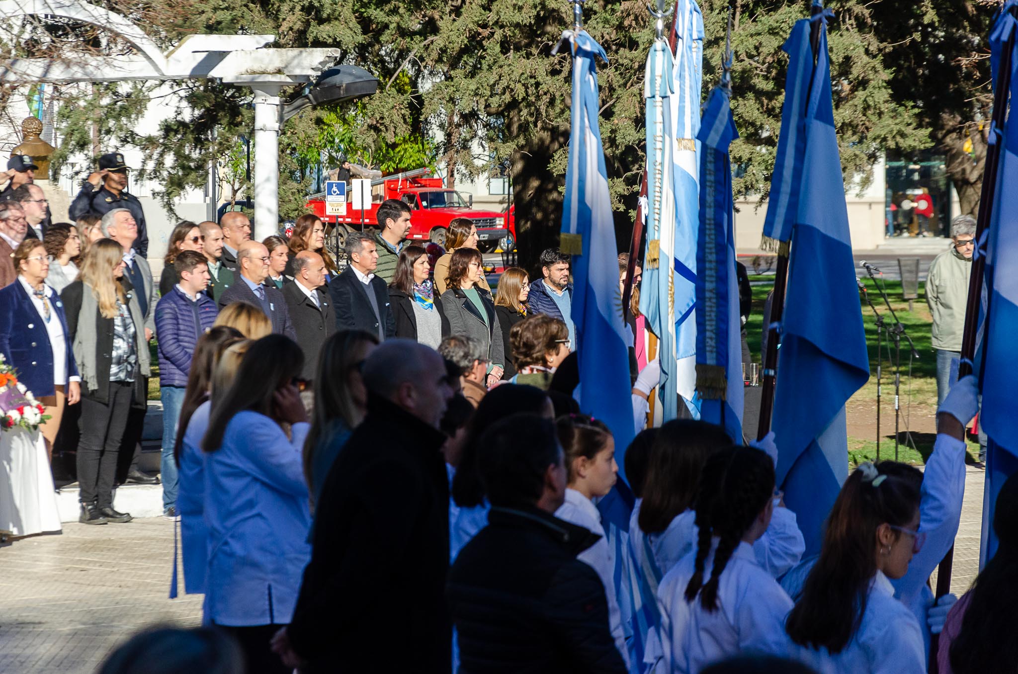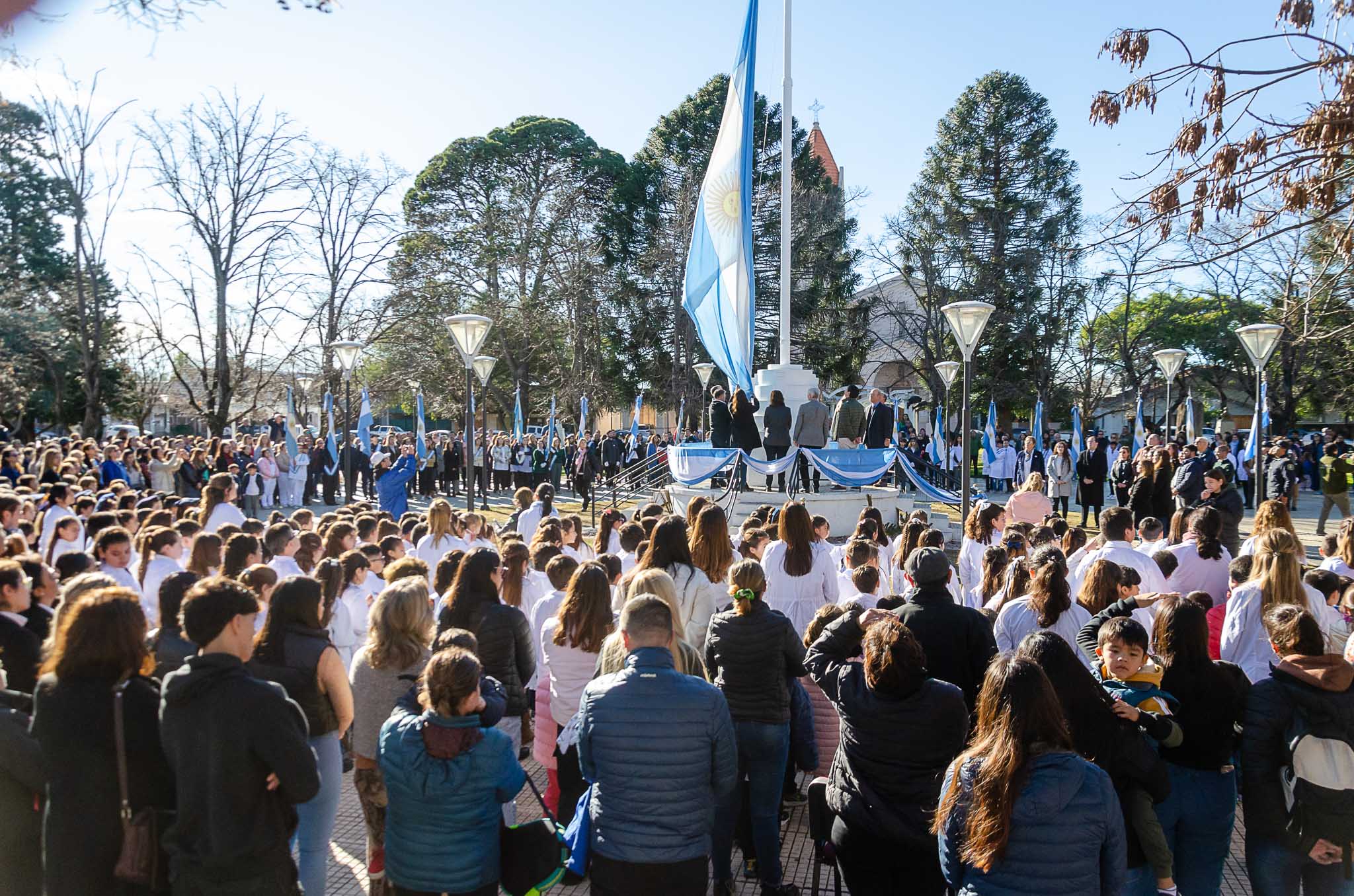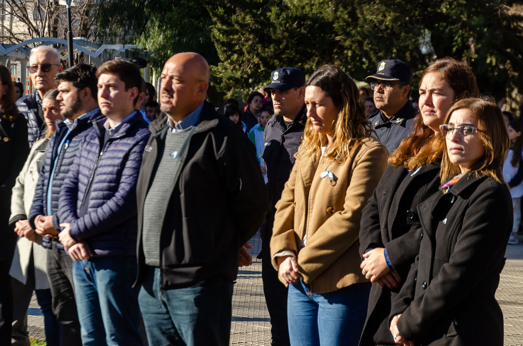 Luego de que las autoridades trasladen la enseña patria al mastil central y se realice el izamiento se entonaron las estrofas del Himno Nacional Argentino. Se procedió a depositar una ofrenda floral por parte del Intendente Juanci Martínez, el Pte. del HCD Jorge Pablo Rosolen, la Inspectora Jefe Distrital Marta Cucurull y la Pte. del Consejo Escolar Daniela Vásquez.