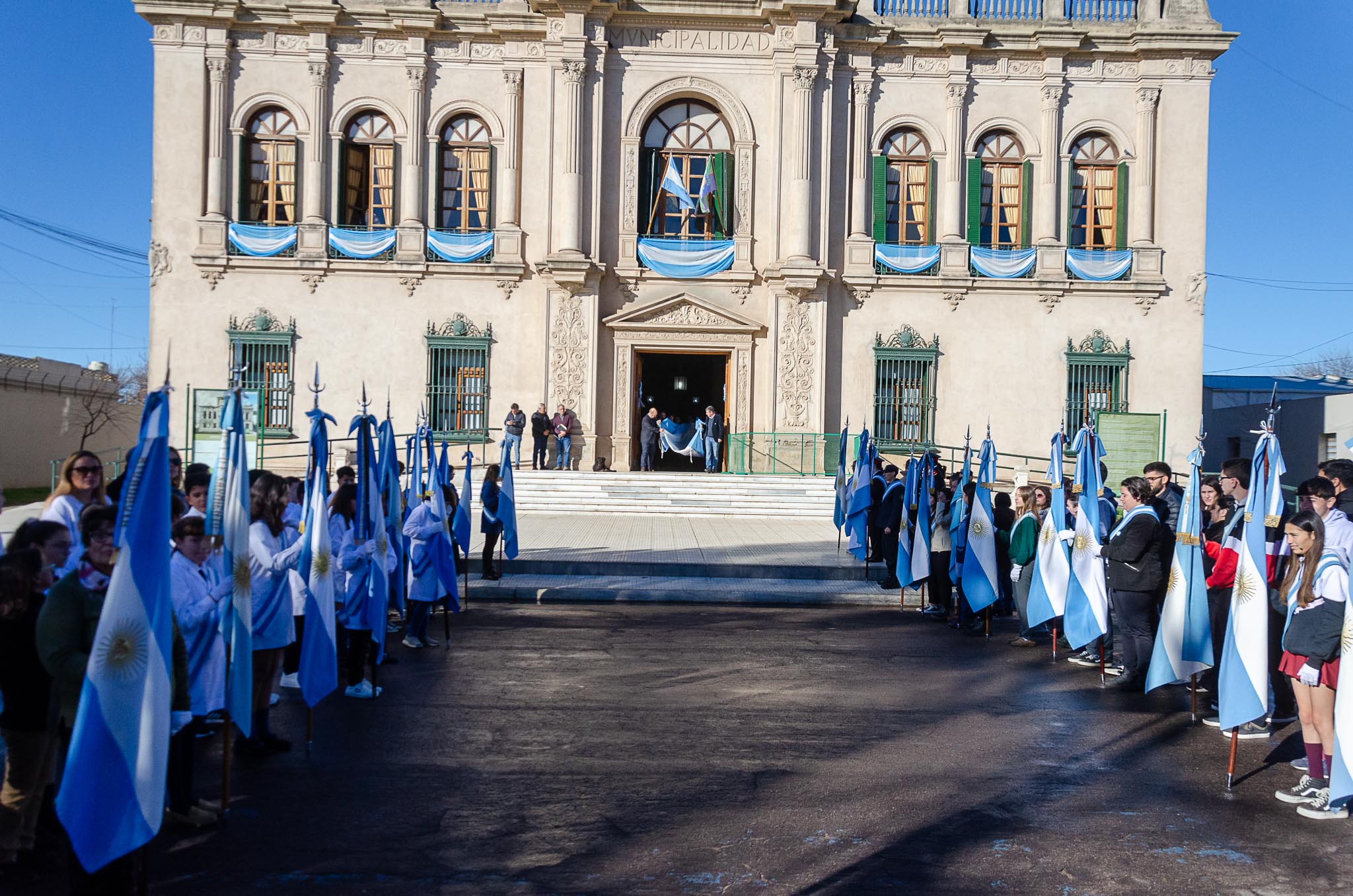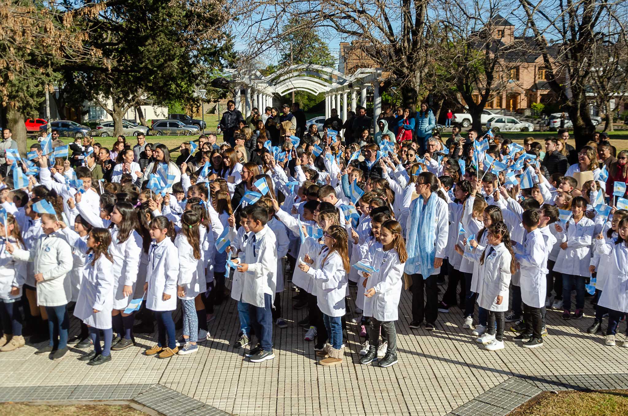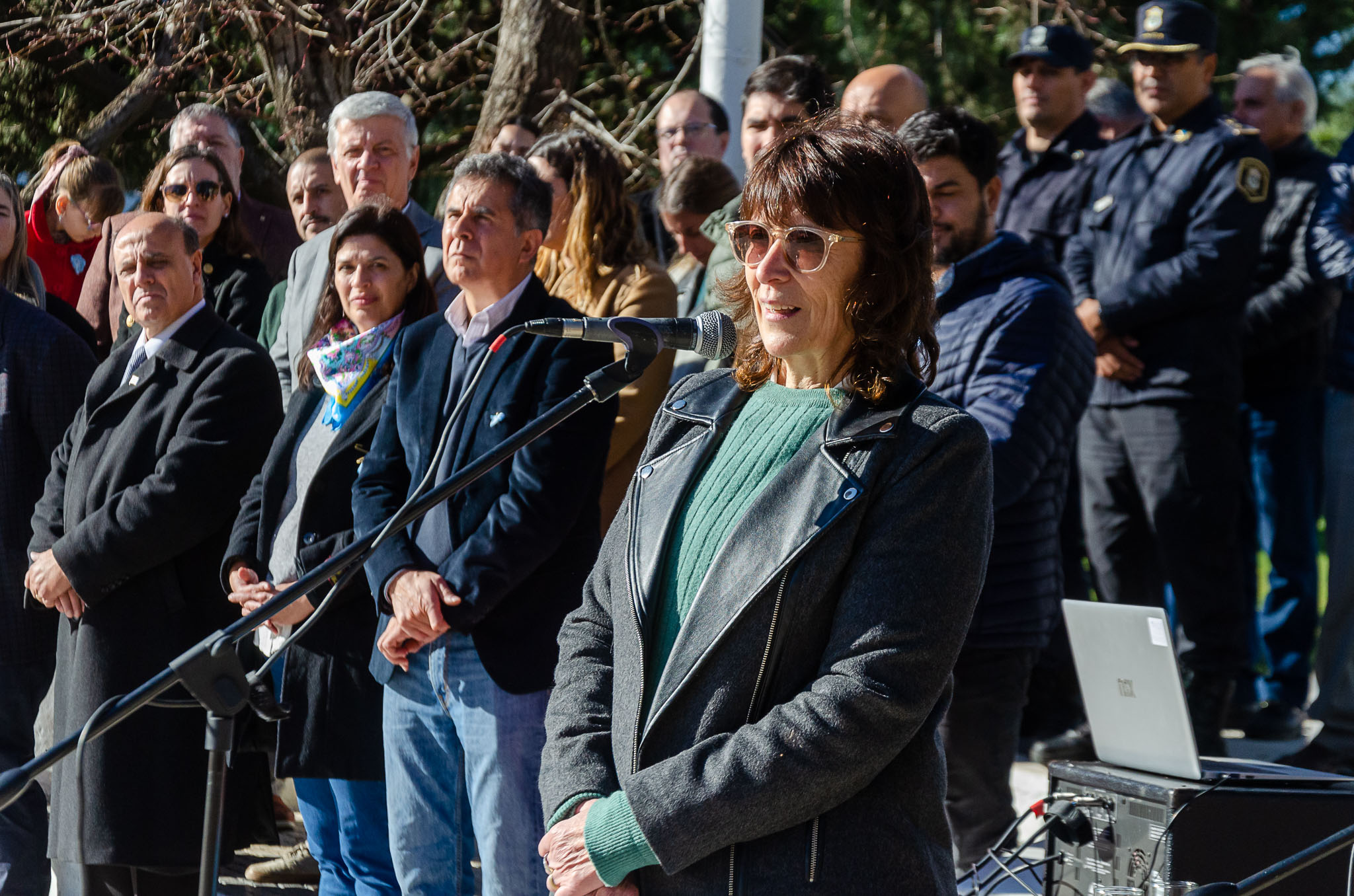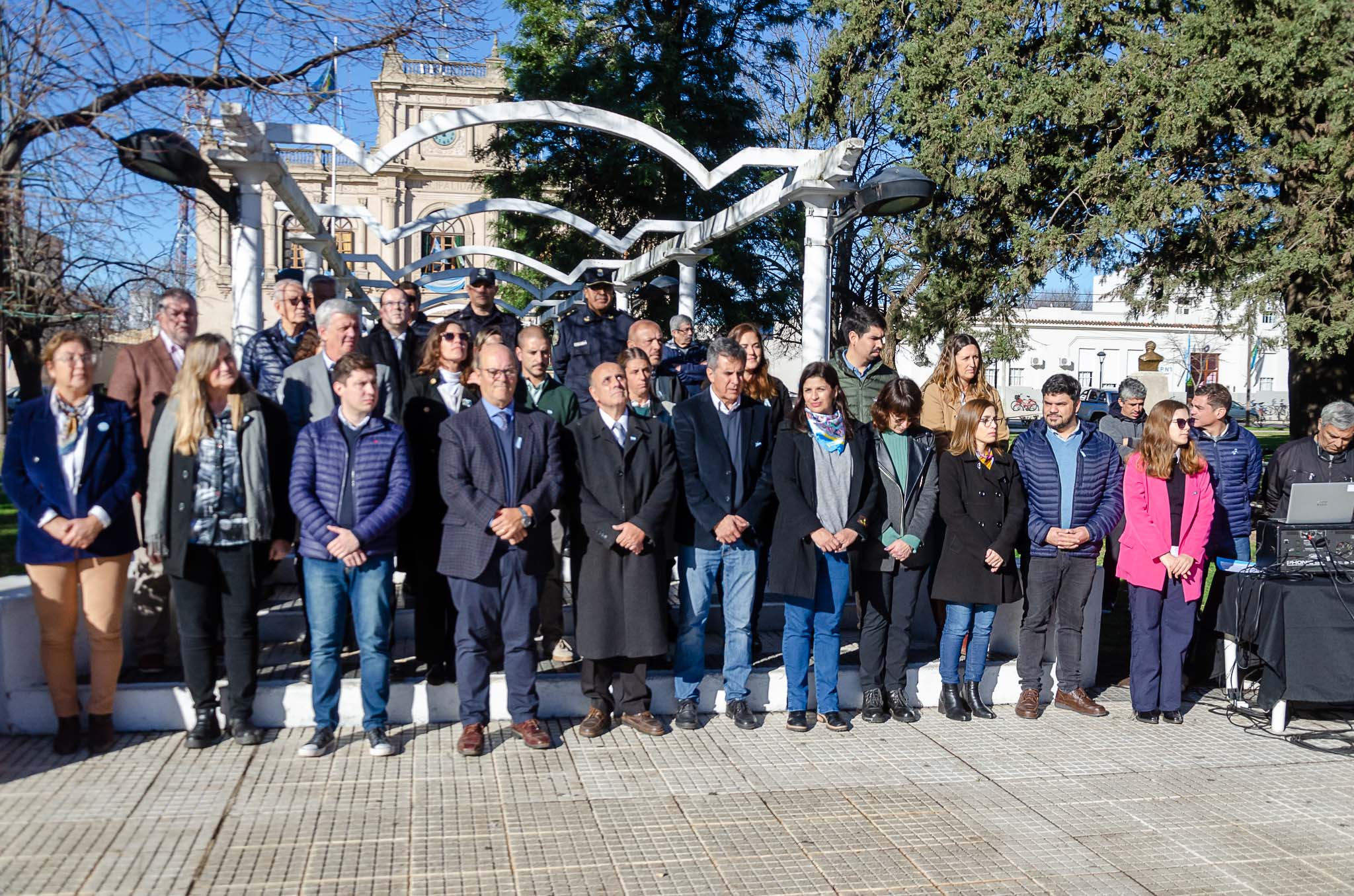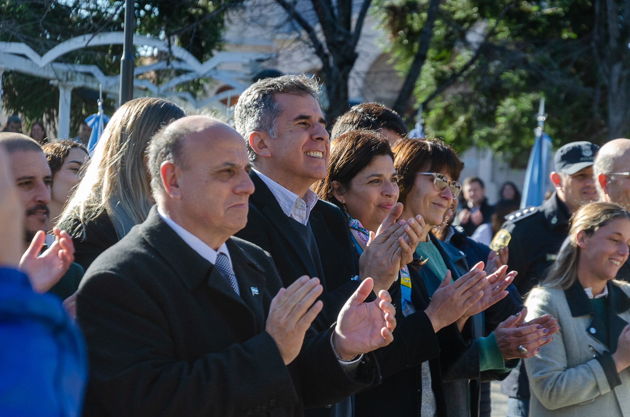 Luego de que las autoridades trasladen la enseña patria al mastil central y se realice el izamiento se entonaron las estrofas del Himno Nacional Argentino. Se procedió a depositar una ofrenda floral por parte del Intendente Juanci Martínez, el Pte. del HCD Jorge Pablo Rosolen, la Inspectora Jefe Distrital Marta Cucurull y la Pte. del Consejo Escolar Daniela Vásquez.