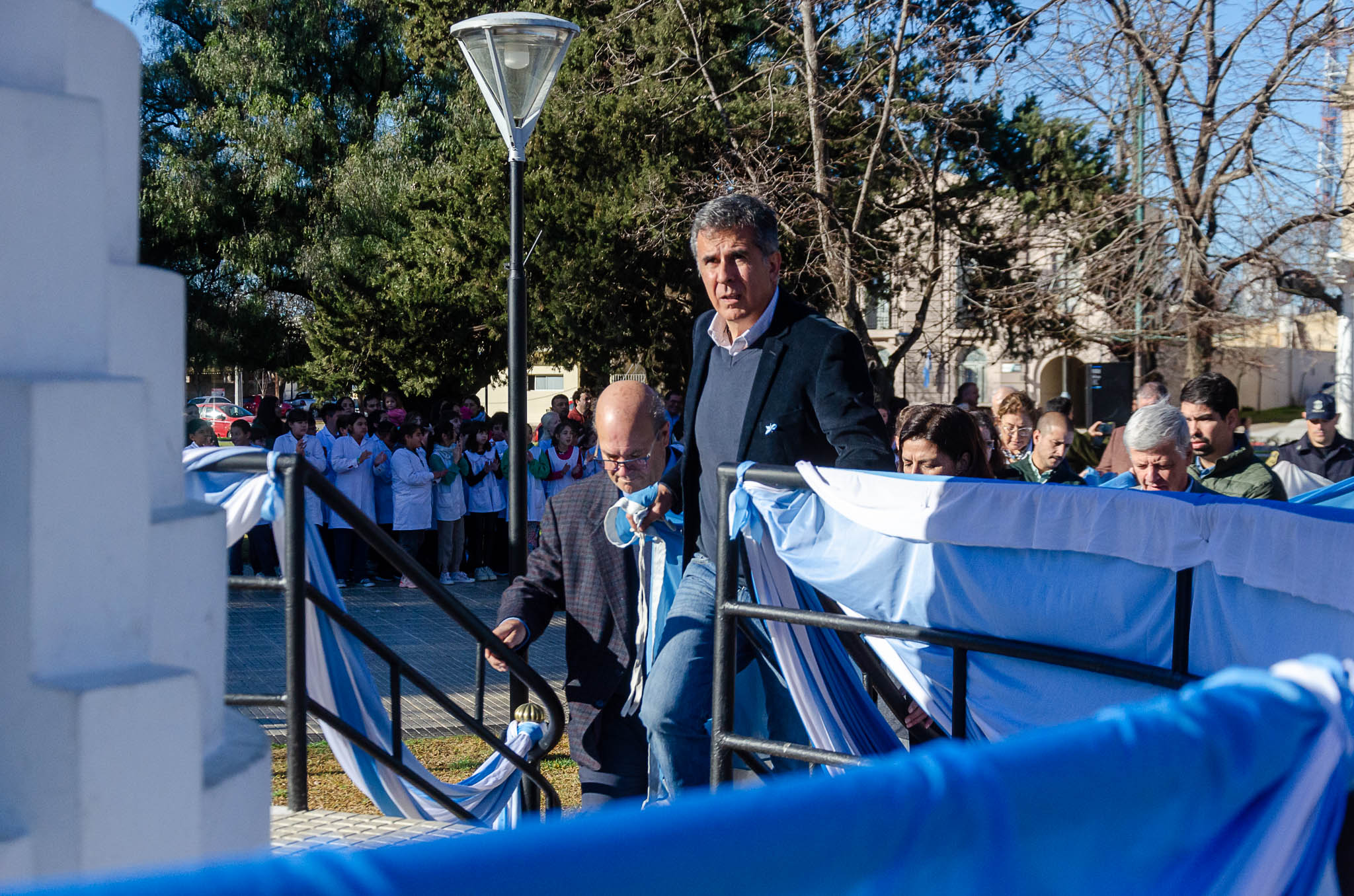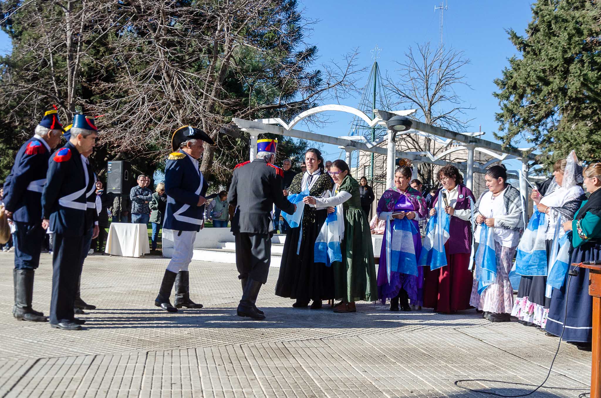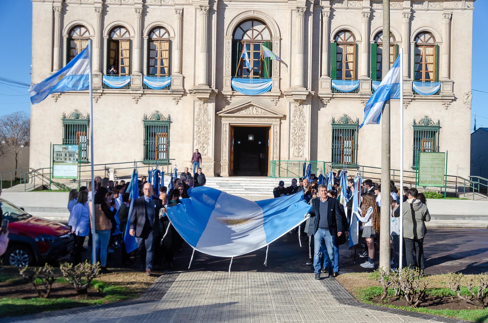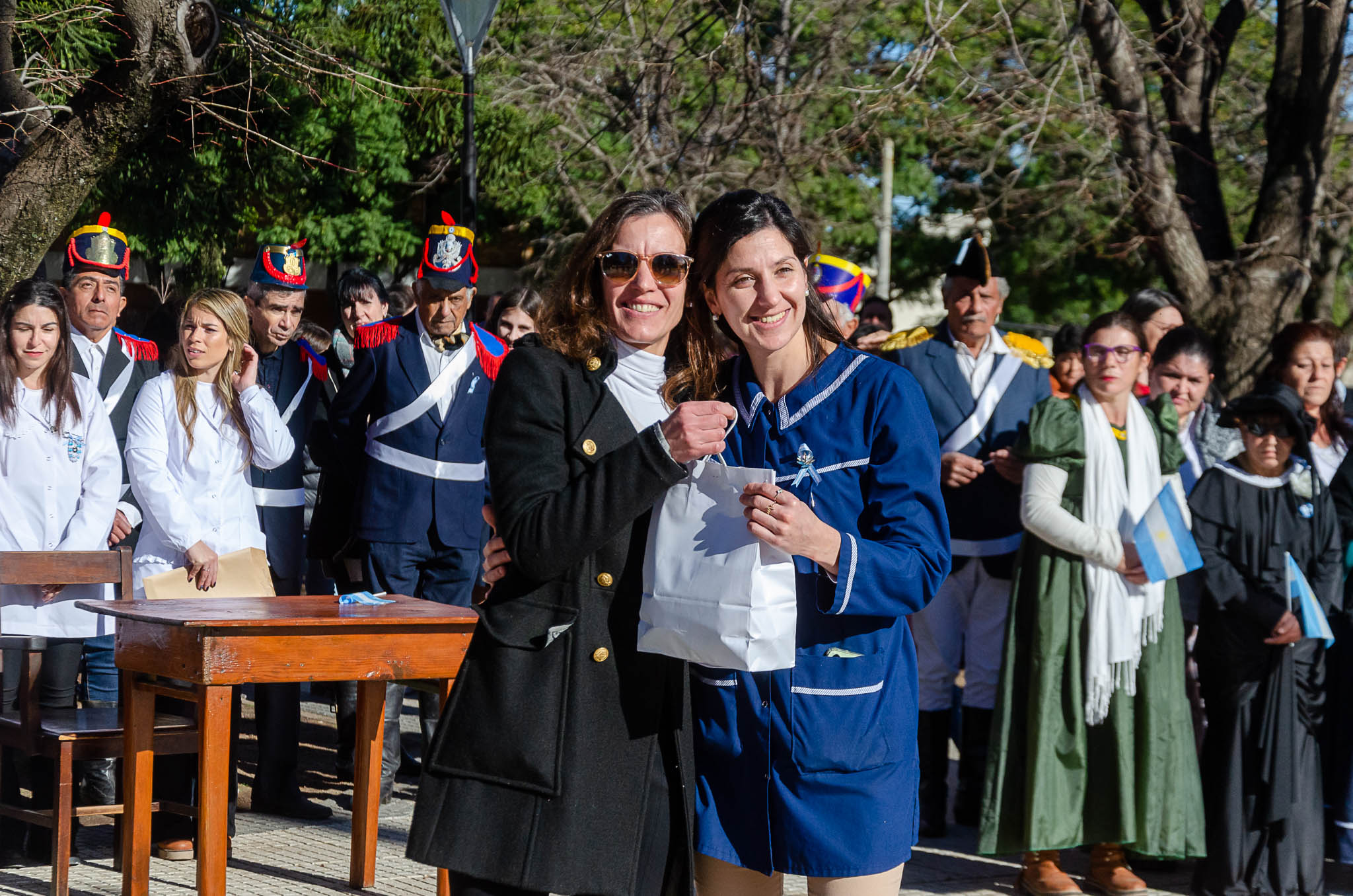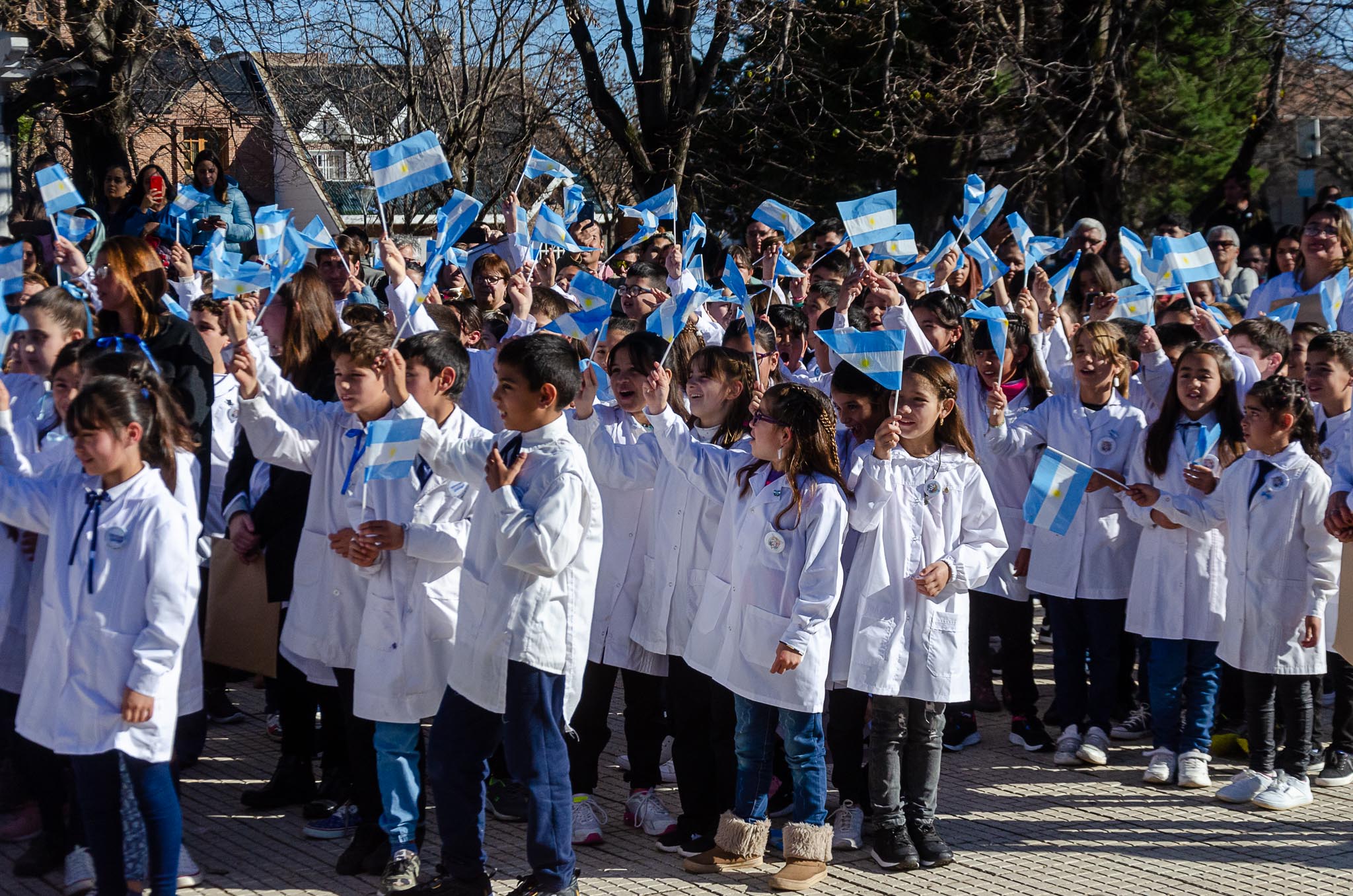 Luego de que las autoridades trasladen la enseña patria al mastil central y se realice el izamiento se entonaron las estrofas del Himno Nacional Argentino. Se procedió a depositar una ofrenda floral por parte del Intendente Juanci Martínez, el Pte. del HCD Jorge Pablo Rosolen, la Inspectora Jefe Distrital Marta Cucurull y la Pte. del Consejo Escolar Daniela Vásquez.