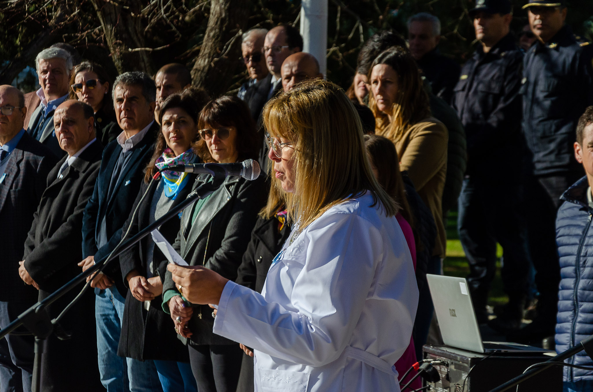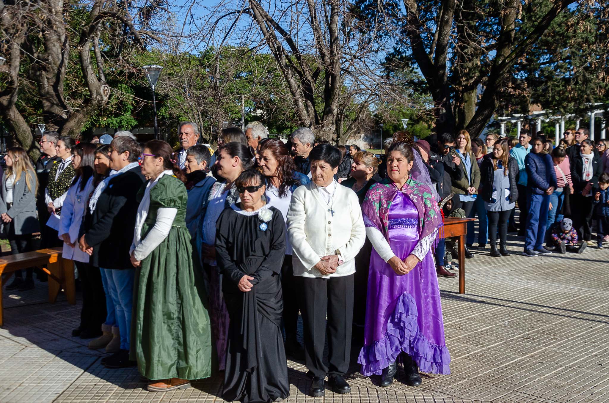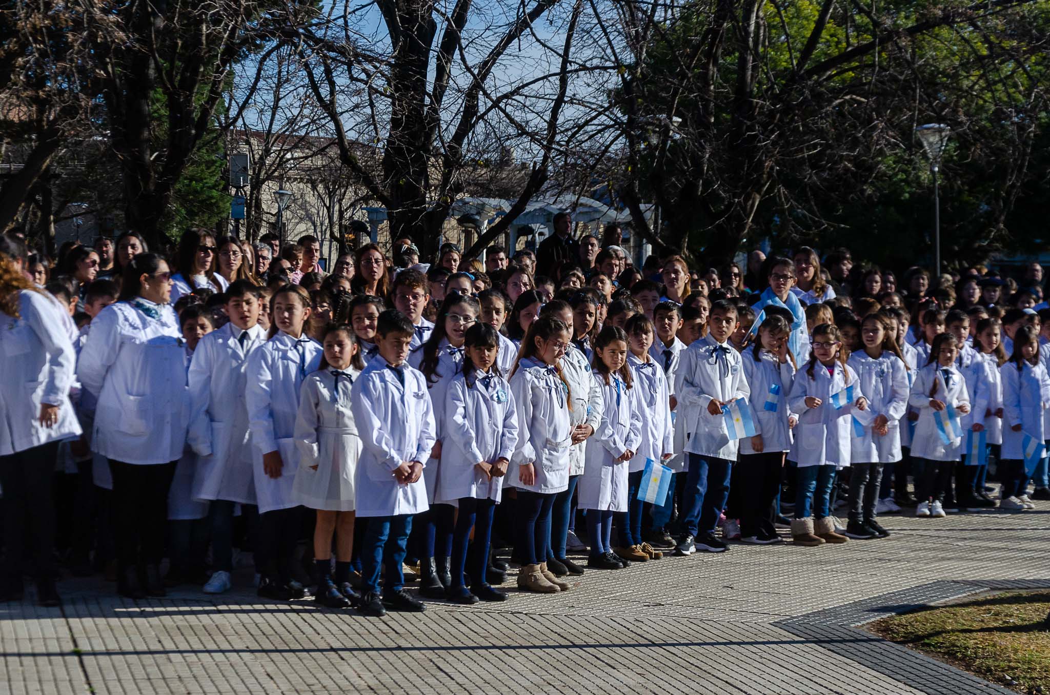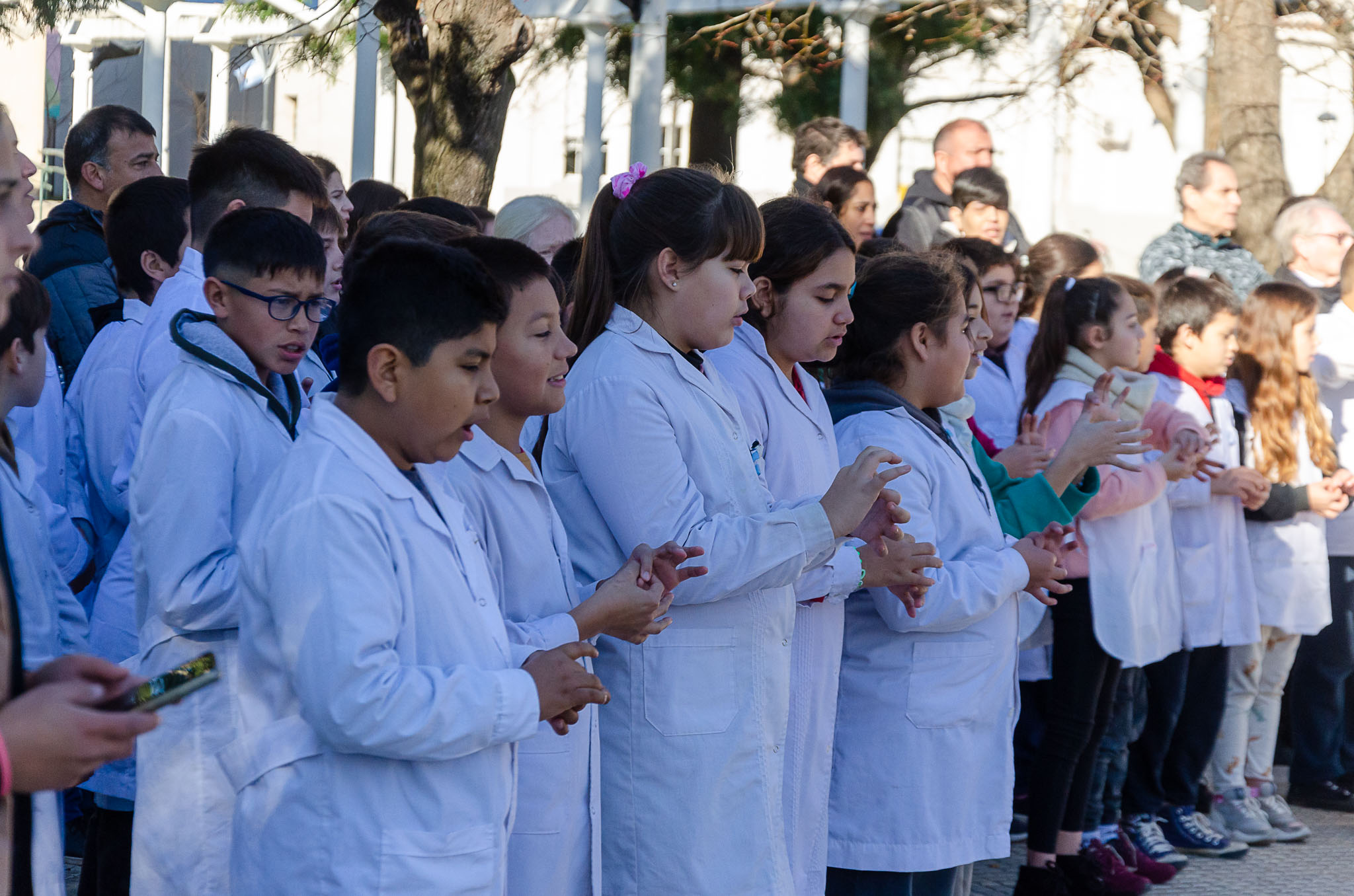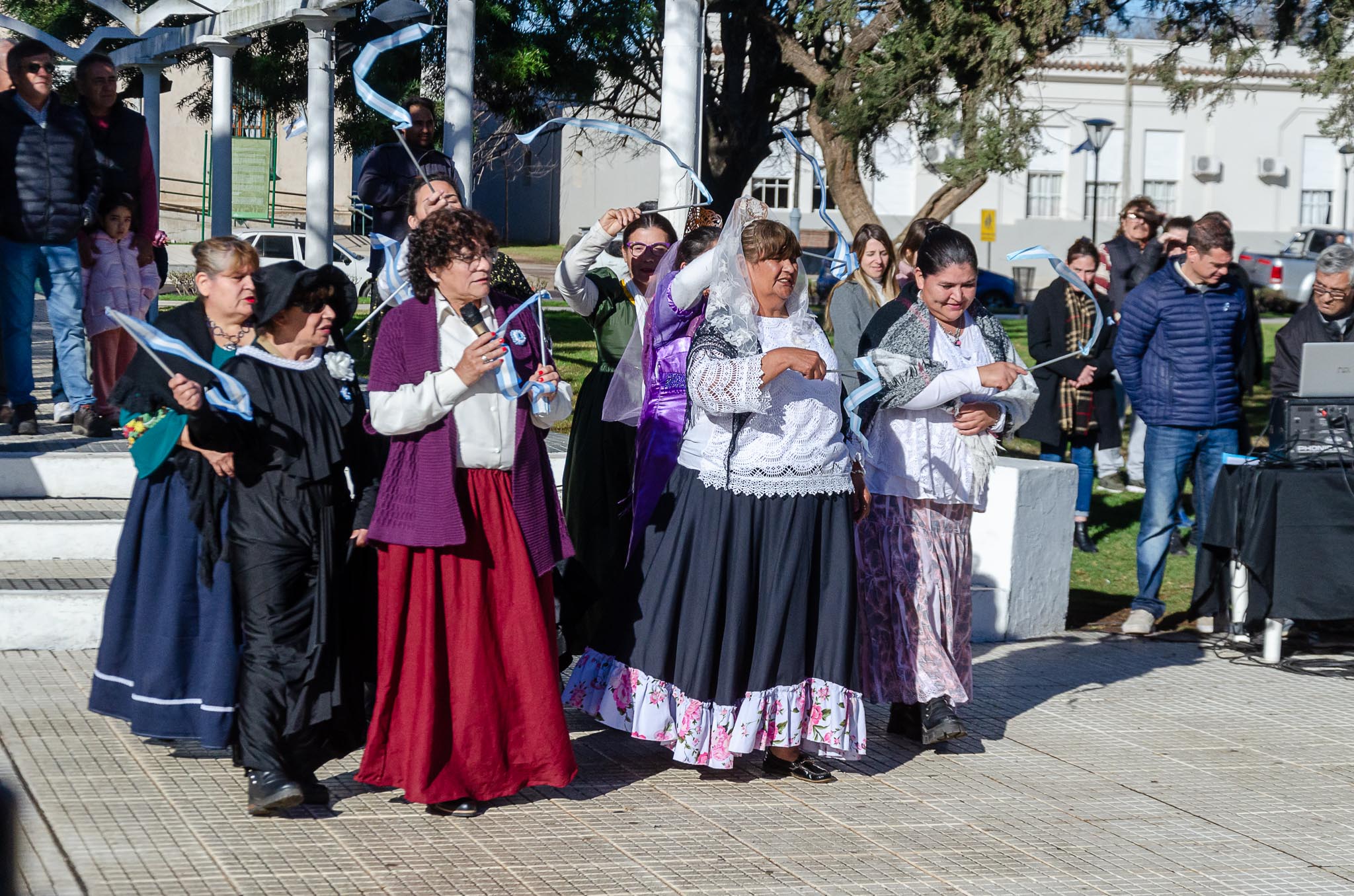 Luego de que las autoridades trasladen la enseña patria al mastil central y se realice el izamiento se entonaron las estrofas del Himno Nacional Argentino. Se procedió a depositar una ofrenda floral por parte del Intendente Juanci Martínez, el Pte. del HCD Jorge Pablo Rosolen, la Inspectora Jefe Distrital Marta Cucurull y la Pte. del Consejo Escolar Daniela Vásquez.