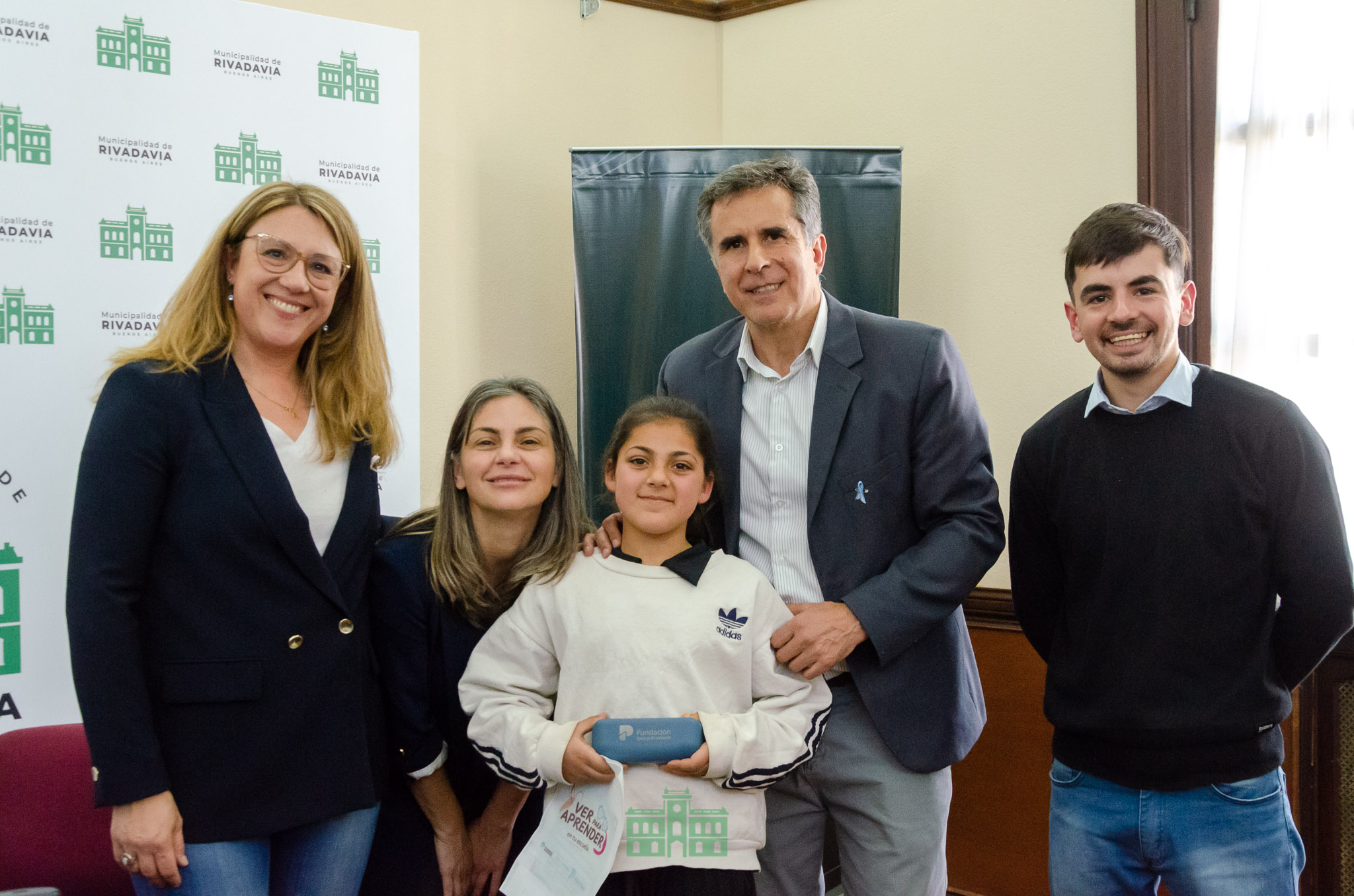 El intendente Juanci Martínez, junto a la presidenta de la Fundación Banco Provincia, Micaela Ferraro, entregaron anteojos a niños de escuelas primarias rurales de Rivadavia.