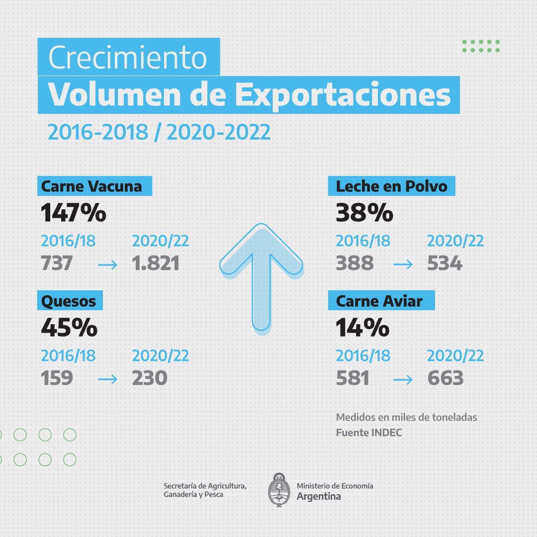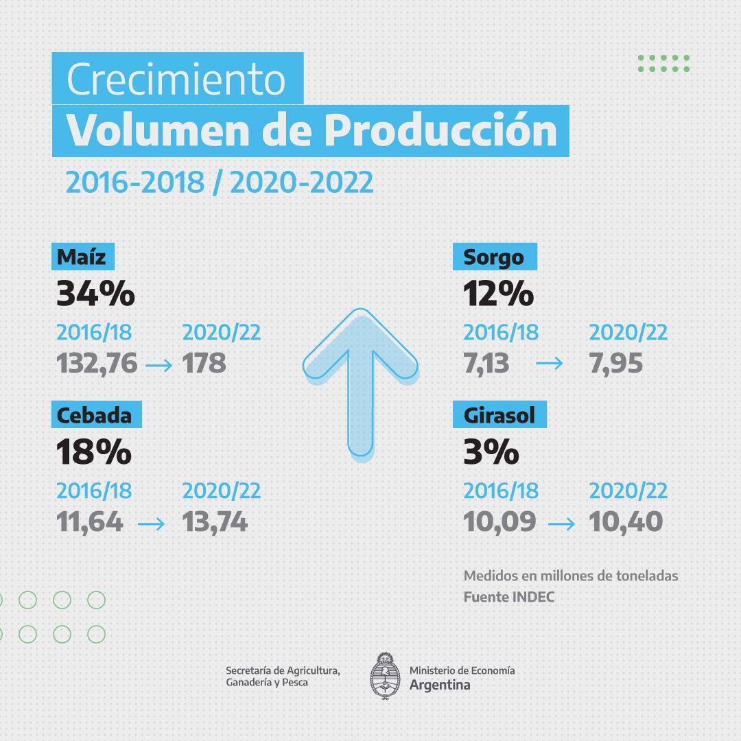 La Secretaría de Agricultura, Ganadería y Pesca de la Nación informa que el trienio 2020-2022 se caracterizó por un fuerte crecimiento de la producción y las exportaciones de los principales rubros de la agroindustria, en comparación con el periodo 2016-2018.