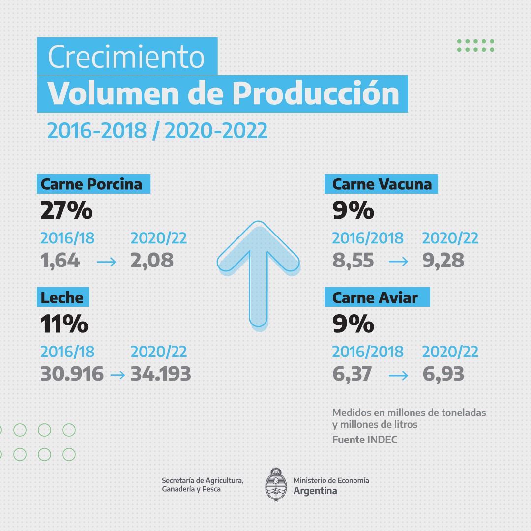 Entre los mismos se destaca que la producción acumulada de carne vacuna y de carne aviar crecieron un 9% cada una, potenciando así la transformación de granos en carne lo que fortalece un esquema de agregado de valor que se traduce en divisas y arraigo.