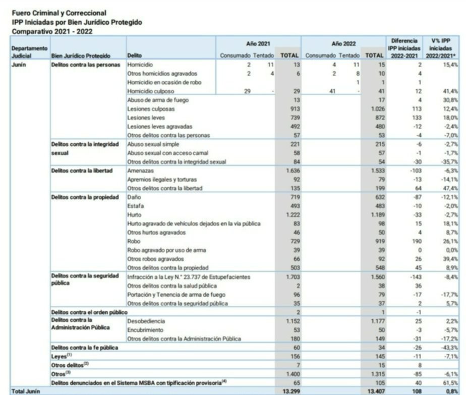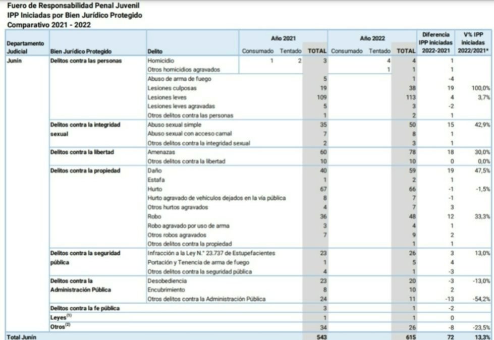 En Junín, al igual que en 17 de los veinte departamentos judiciales, se evidencia un aumento en la cantidad de IPP iniciadas en relación a 2021. El mayor aumento se dio en las IPP correspondiente al Fuero de Responsabilidad Penal Juvenil, que aumentaron un 13,3% respecto a 2021.