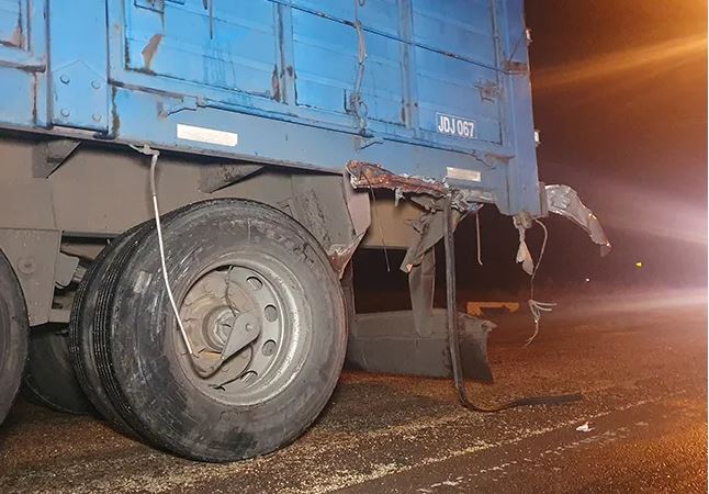 Por lo que se aprecia, el conductor en un acto reflejo y al ver que no podría evitar el choque maniobró hacia su izquierda dando con el lado del acompañante de lleno en el extremo trasero izquierdo del acoplado.